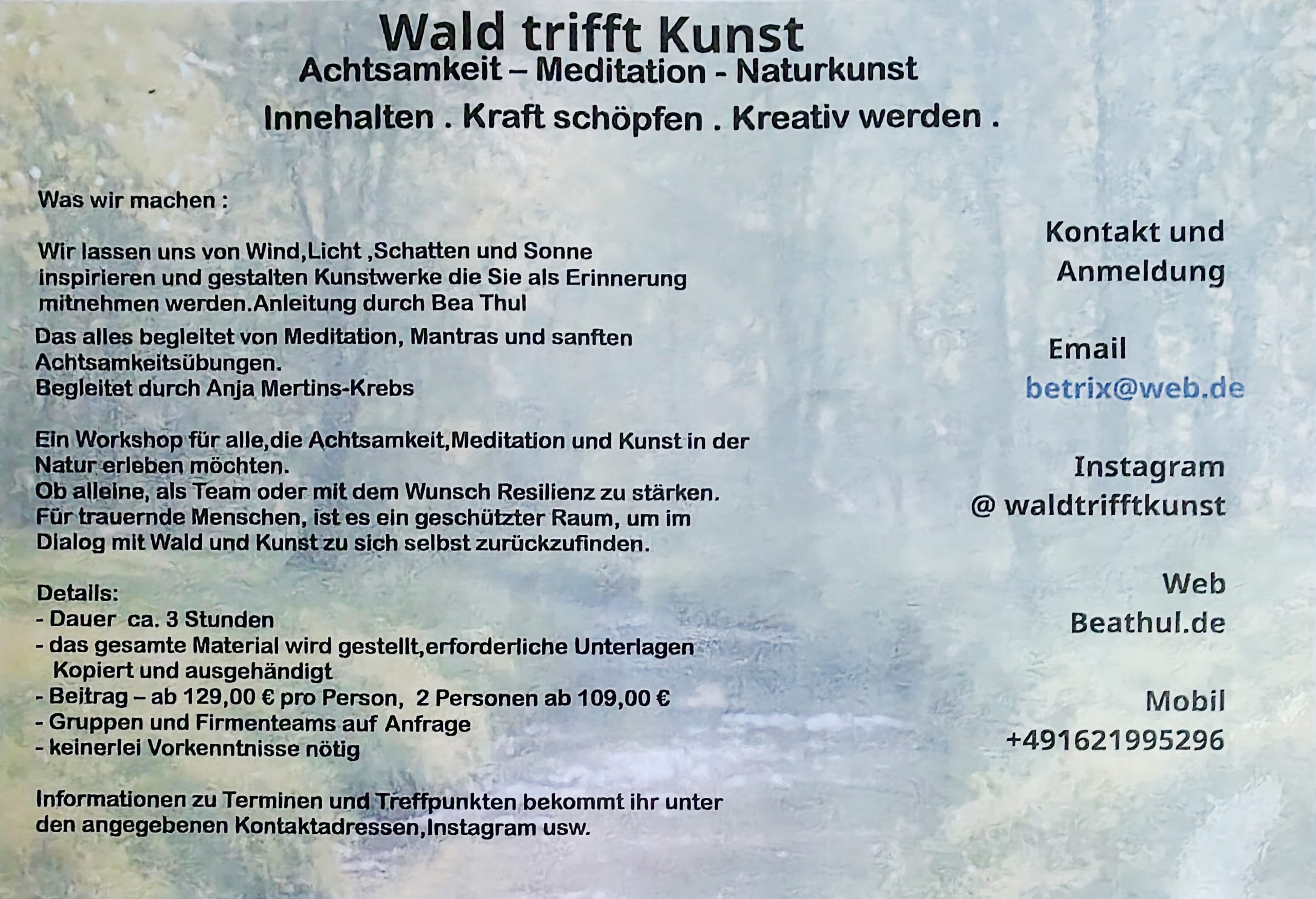 Unser Programm „Wald trifft Kunst“ will helfen, Wege aus der Trauer-Ohnmacht zu finden. Gibt es dafür einen besseren Ort, als mitten in der Natur zu sein? Nein. Der Wald schenkt uns den Raum, zurückzufinden in ein neues Selbst, in eine neue Ordnung. Hier darf Trauer das sein, was sie ist. Achtsame Rituale, kreativer Ausdruck und die Kraft des Waldes helfen, die eigene Mitte zu fühlen und wieder zu entdecken, die eigene Stimme zu hören. Die Achtsamkeitsübungen helfen, im Hier und Jetzt zu sein, fördern Ausgeglichenheit und emotionale Stabilität, genauso wie angeleitete Atemübungen und das Singen von Mantras. Die Kunstprojekte in unserem Programm schaffen die Möglichkeit, all das zum Ausdruck zu bringen, was noch nicht ausgesprochen werden kann – Wut, Schmerz, Liebe, Hoffnung, Verzweiflung, Hilflosigkeit, Überforderung. In kleinen Gruppen erleben Trauernde Gemeinschaft. Trauer wird geteilt und dadurch etwas leichter. In Ritualen und kreativem Arbeiten kann ein Andenken geformt werden, das Halt gibt, Loslassen (nicht das Vergessen) eingeübt werden, das beim achtsamen Weitergehen mit der Erinnerung im Herzen hilft.