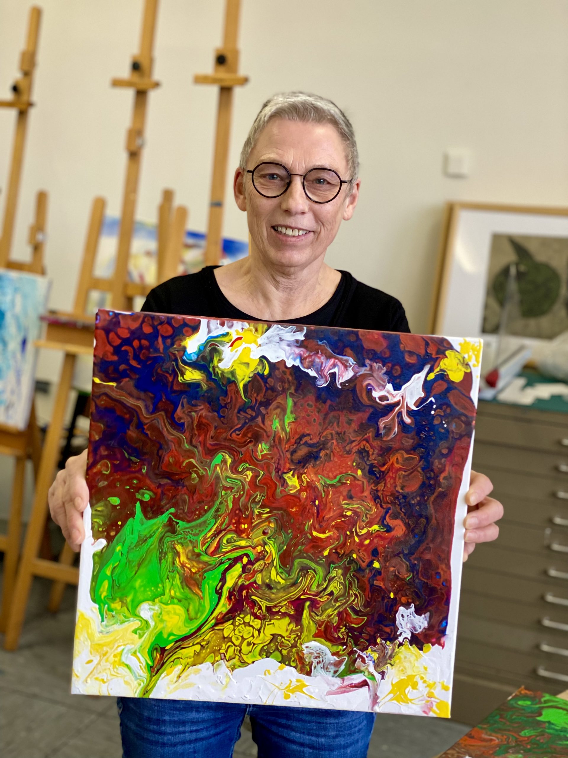 Heike betrachtet ihr Kunstwerk und resümiert: „Wenn die Farben ineinanderfließen, entsteht immer wieder etwas Neues. Das Bild verändert sich ständig. So ist es auch im Leben. Alles fließt und man muss den Mut haben, Veränderungen zuzulassen und loszulassen.“