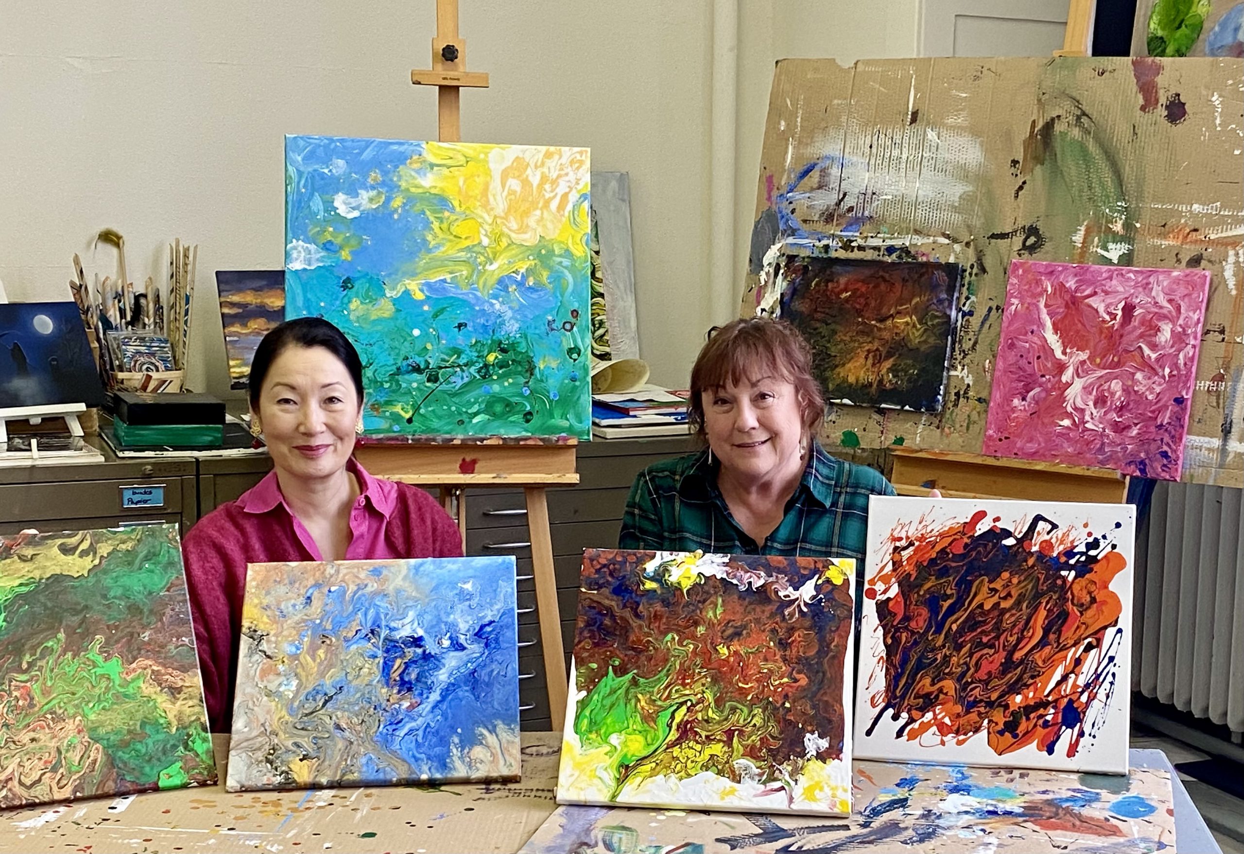 Emotionen Farben geben – Corinna Lee (links) und Bea Thul mit den Werken der ehrenamtlichen Sterbebegleiterinnen.